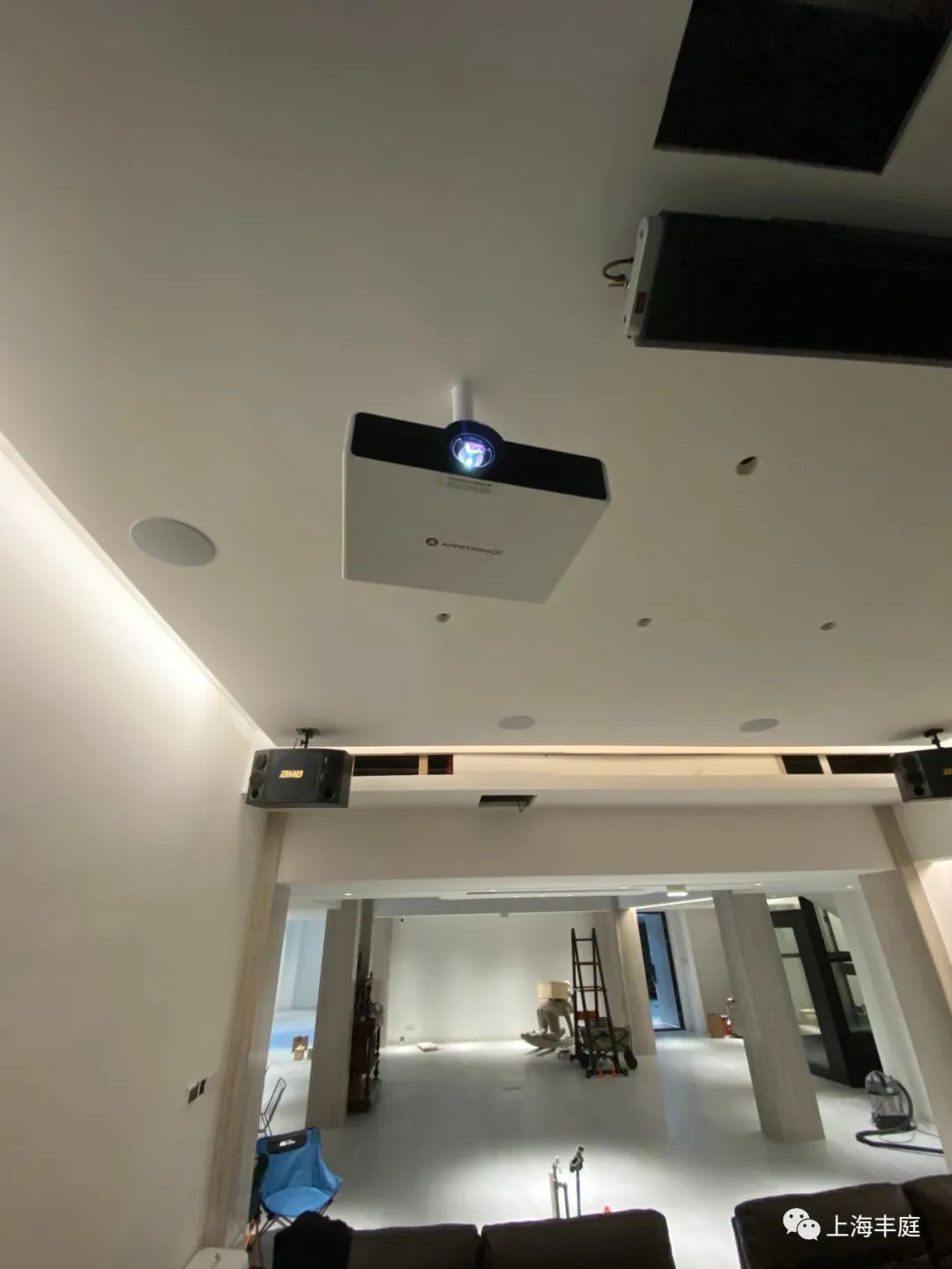 在卡拉OK系統(tǒng)的設計上,我們根據實際測試,客戶地下室空間較大,又是開放式影院,導致前主音箱打出來的聲音不夠聚合,所以我們主梁的位置,我們又加了兩個卡拉OK補聲音響。